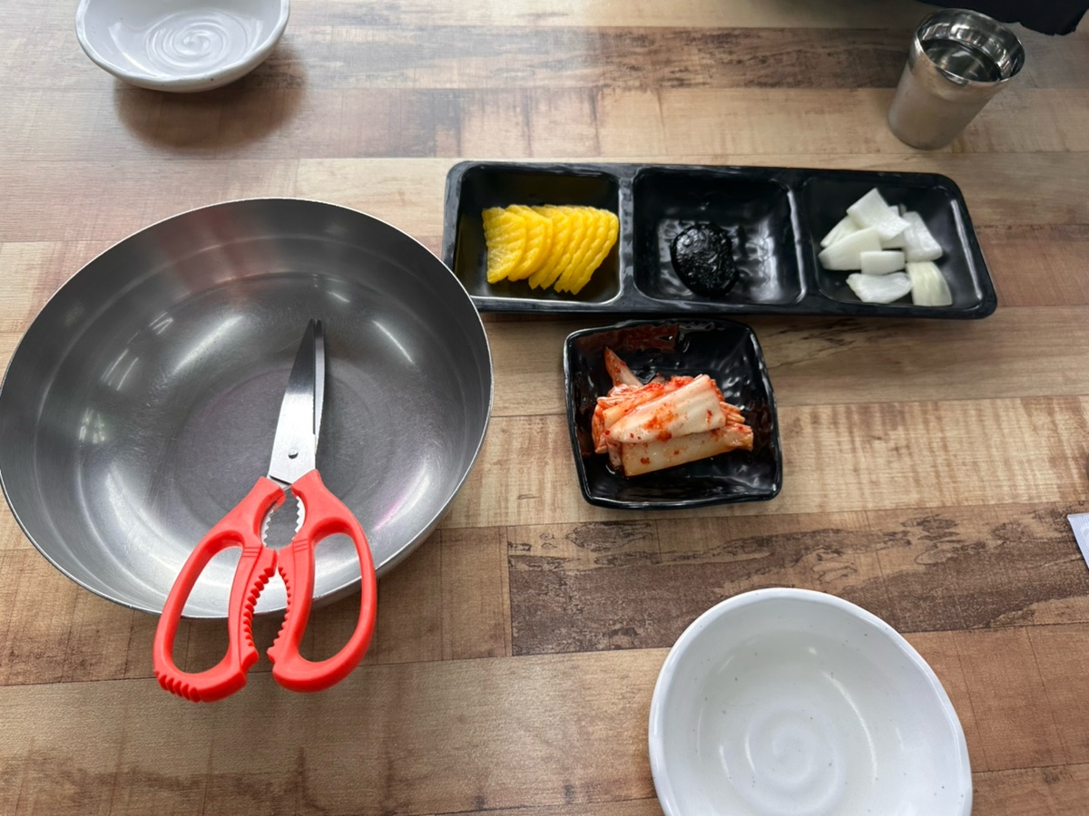 기본 세팅인데요 단무지 양파 김치 그리고 큰대접을 주셨는데 뭔가 싶엇지만 조개 껍데기 버리는 그릇이더라구요